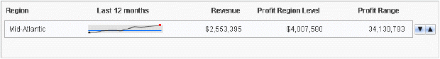 The Microcharts widget consists of compact representations of data that allow analysts to quickly visualize trends in data. Microcharts convey information so that a user can, at a glance, determine the trend of a metric over time or how a metric is performing compared to forecasted figures. The Microcharts widget is useful for this purpose because individual microcharts can display attribute and metric data in a small graph that would otherwise be displayed as a single value in a grid report cell.