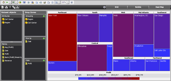 The image below shows a Heat Map visualization in the same analysis, which displays the data using colored rectangles of different sizes and colors depending on the cost and profit data for each Call Center. You can format the colors used to display the rectangles, delete rectangles from the display, and change how the size and position of the rectangles is calculated.